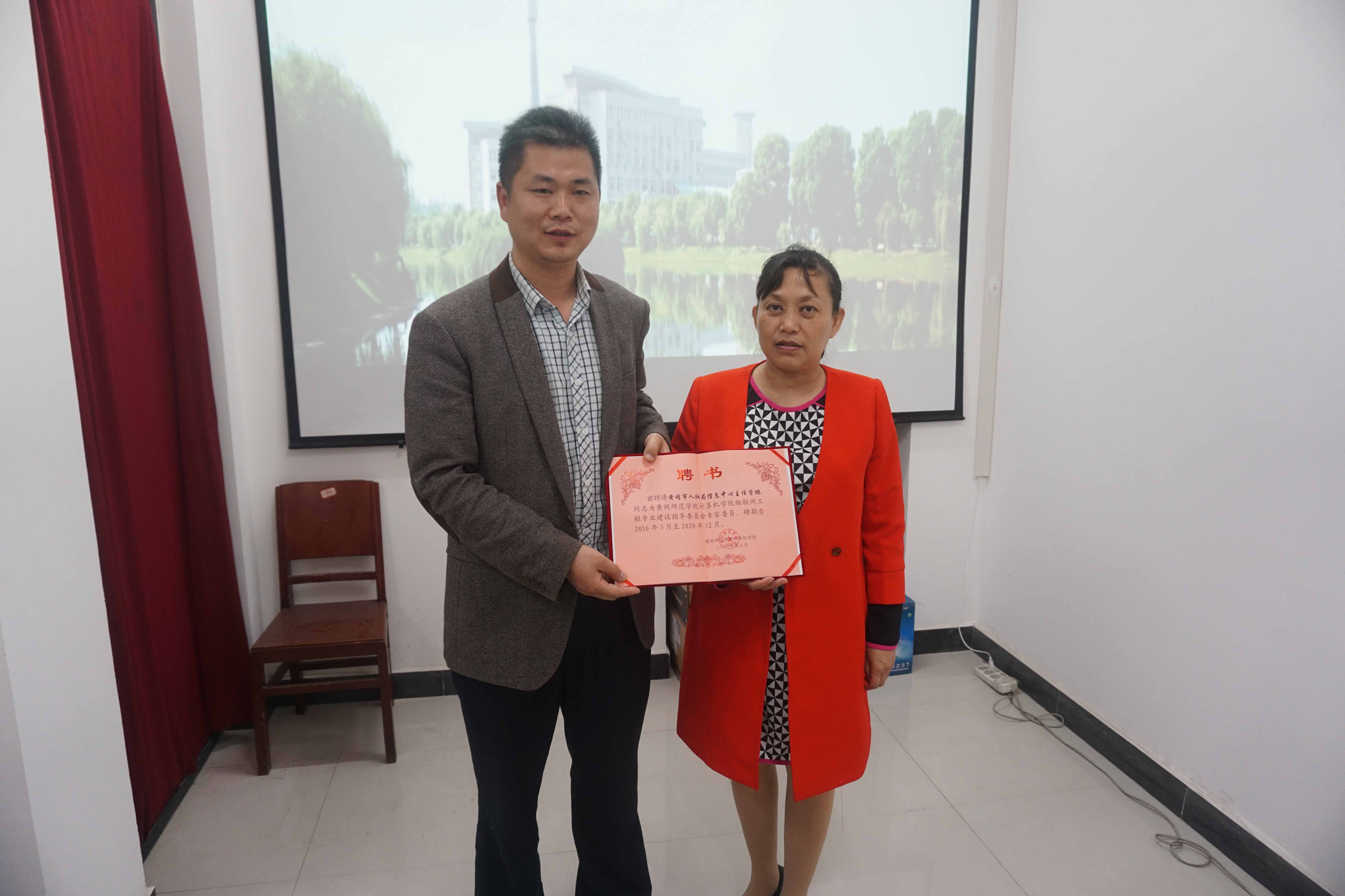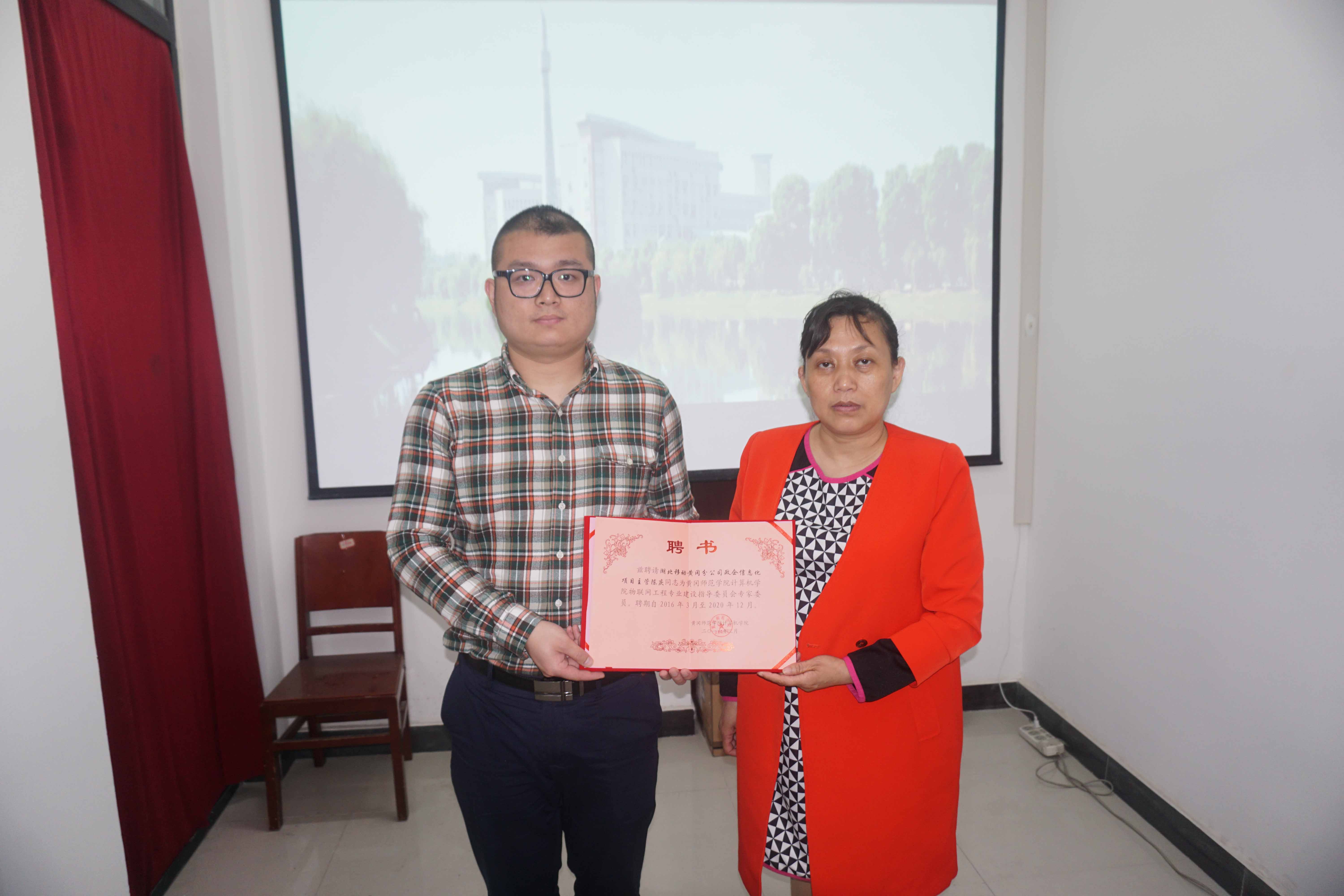 为了适应物联网技术发展新形势,创新人才培养模式,提高人才培养质量,提升学院服务经济社会发展能力,学院特聘请了湖北移动黄冈分公司政企信息化项目主管陈庆、黄冈市人社局信息中心主任管鹏为我院物联网工程专业建设指导委员会委员。