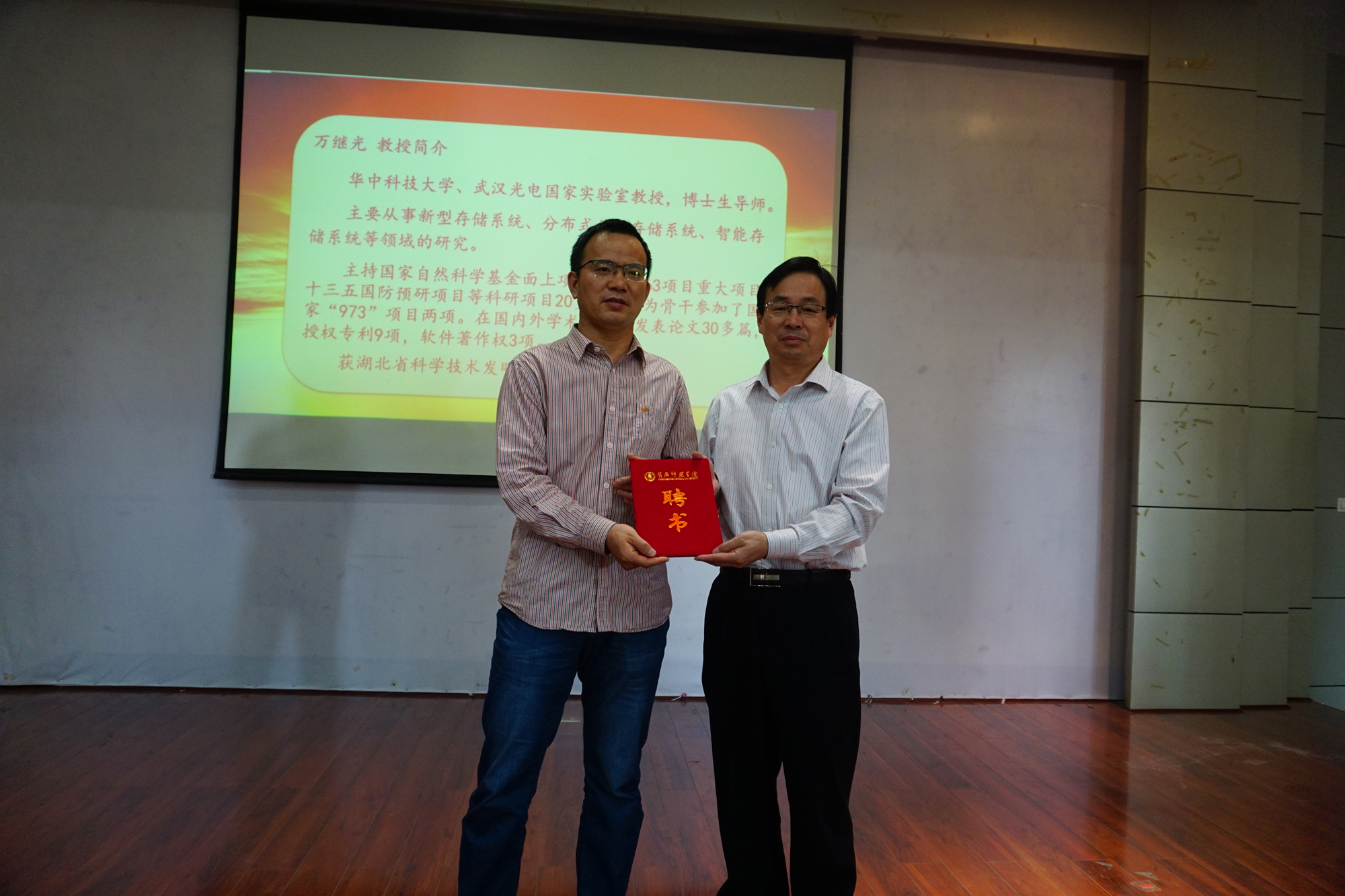 10月11日下午,应我校邀请,华中科技大学bevictor伟德存储所、武汉光电国家实验室存储部万继光教授来我校作学术报告。报告会在博学楼B03学术报告厅举行,校党委常委王锋出席会议并代表学校向万教授颁发了客座教授聘书。bevictor伟德200余位师生参加了报告会。报告会由bevictor伟德院长胡志华主持。