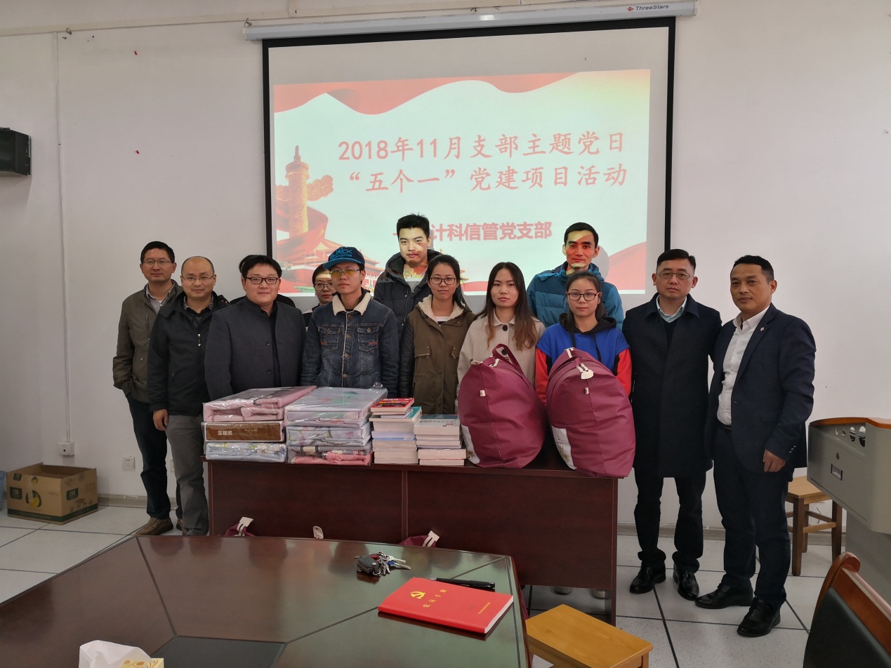 11月8日下午,我院计科信管党支部在逸夫楼305开展2018年11月支部主题党日暨“帮困助学”活动。计科信管党支部全体党员,以及部分“五个一”帮扶学生参加了本次活动。