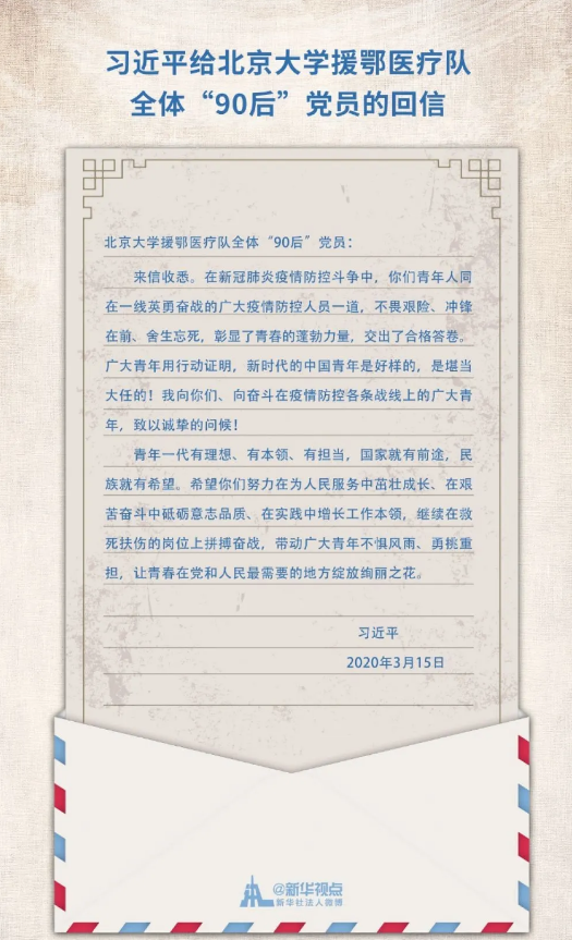 近日,北京大学援鄂医疗队的34名“90后”党员给习近平总书记写信,汇报了在抗疫一线抢救生命的情况,表达了继续发挥党员作用、为打赢疫情防控阻击战贡献力量的决心。而习近平总书记给他们的回信也引起了巨大的反响。习总书记在书信中极力赞扬了九零后广大青年。