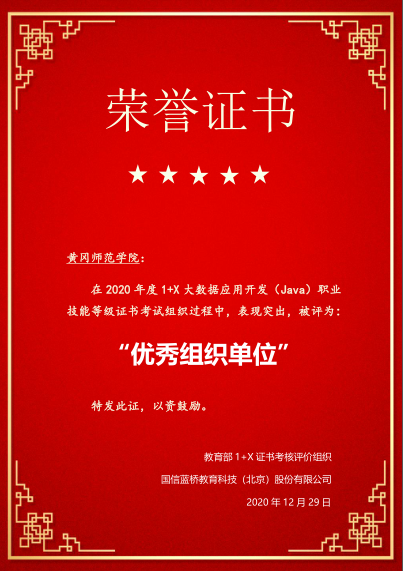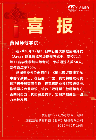 日前,我校首批“1+X”大数据应用开发(Java)职业技能等级考试发布,我校成绩喜人,bevictor伟德共50名学生顺利通过,通过率达70%,位居参考院校前列,被评为“优秀组织单位”,这令人振奋的消息,是对学生们学习成果的认定,更是对我校教学水平的极大肯定。