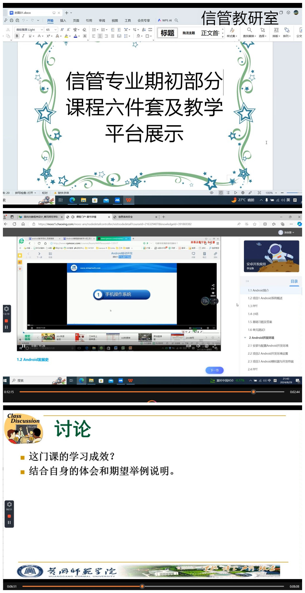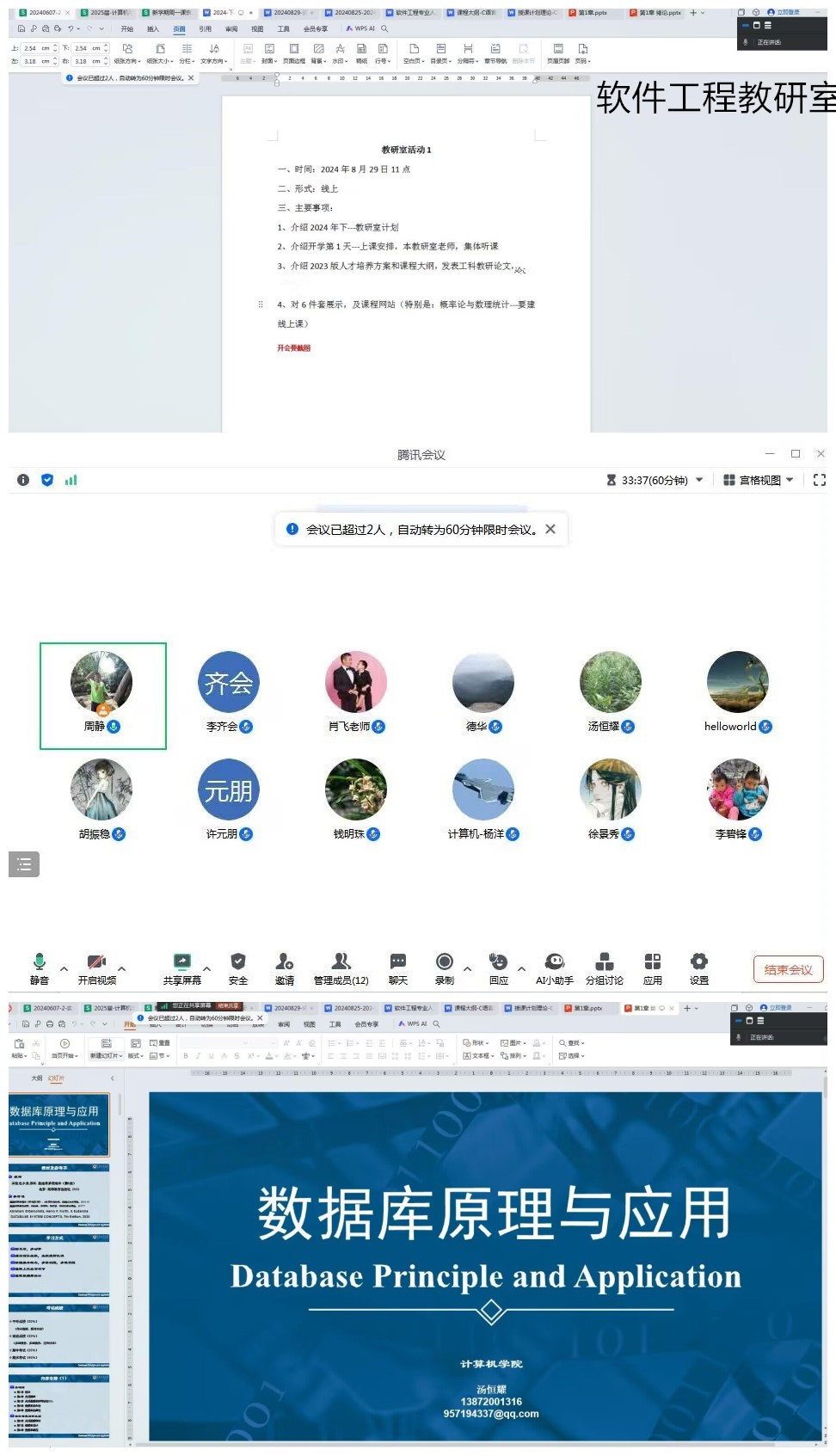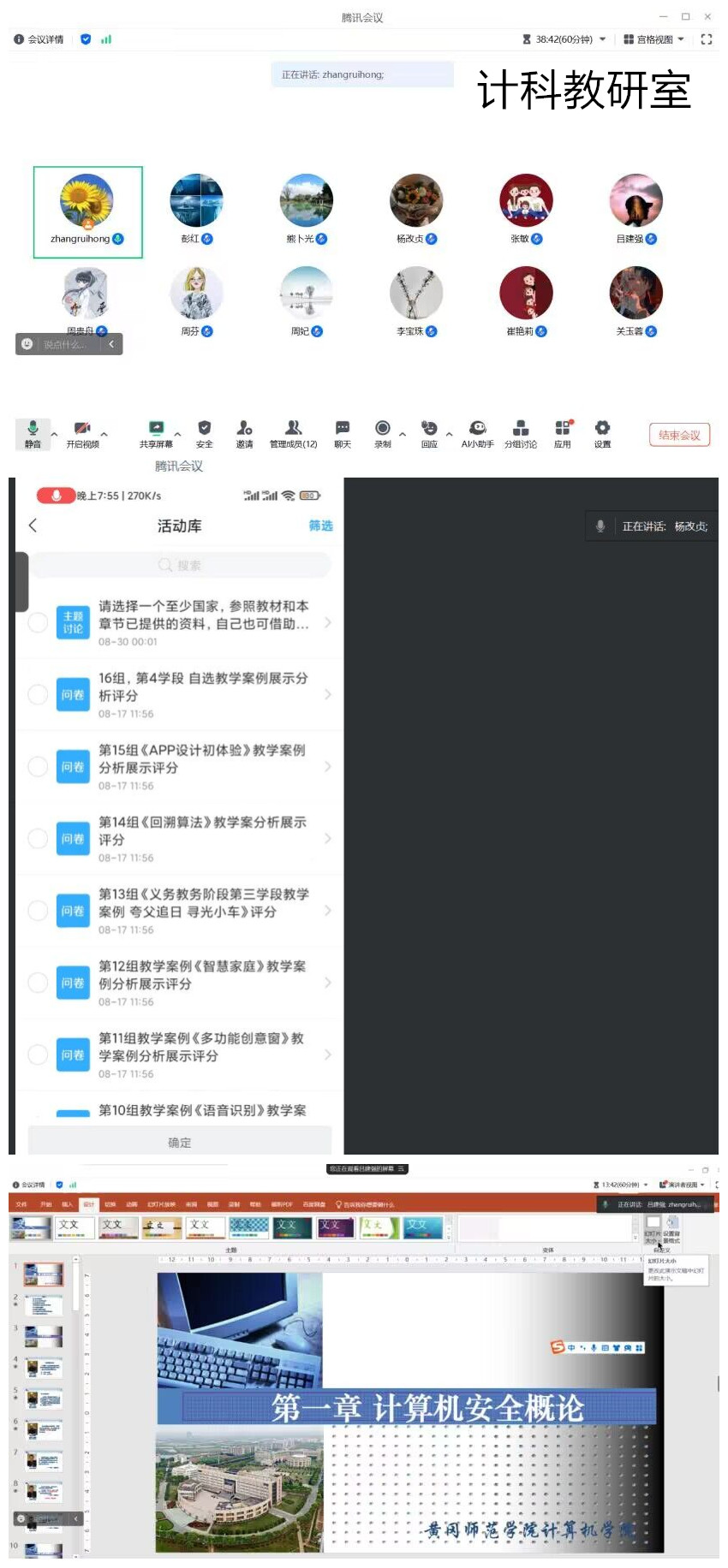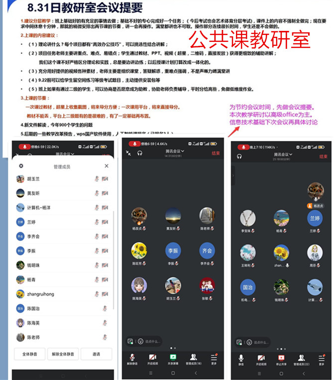 各教研室采用线上会议与讨论相结合的方式开展活动。从讨论2024年下半年教研室工作计划、准备开学第1天上课准备和集中听课研课、讨论学习2023版人才培养方案和课程大纲、展演和研讨课程课件及线上课程建设等方面进行。